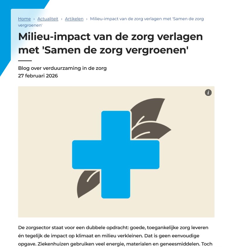 In dit interview met ZonMw laten Nicole Hunfeld, programmaleider Samen de zorg vergroenen, en verpleegkundige Ilse van de Laar van Elisabeth-TweeSteden Ziekenhuis (ETZ), zien hoe we binnen Samen de zorg vergroenen de transitie naar duurzame, verstandige zorg versnellen.